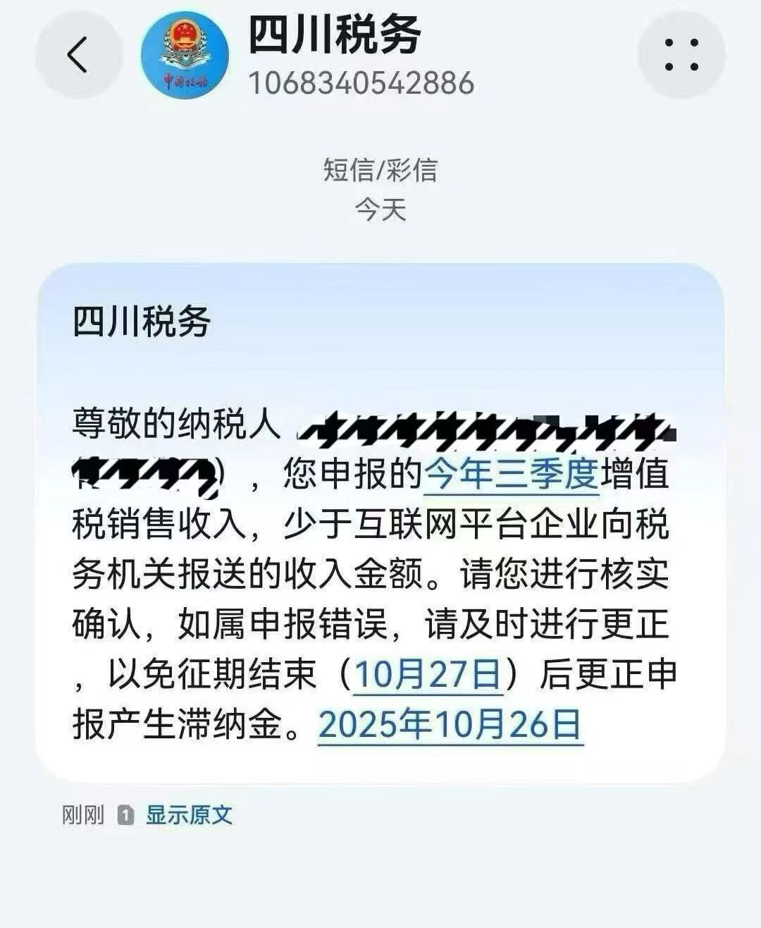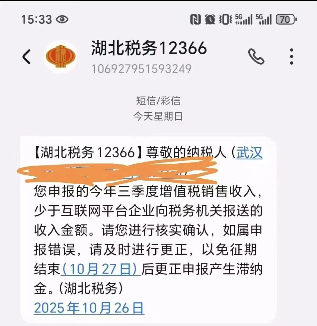就在这个周末,我们注意到四川、湖北、深圳等地的许多纳税人,都收到了来自当地税务局的紧急提醒短信(如图示)。短信内容核心一致:“您申报的今年三季度增值税销售收入,少于互联网平台企业向税务机关报送的收入金额。”
