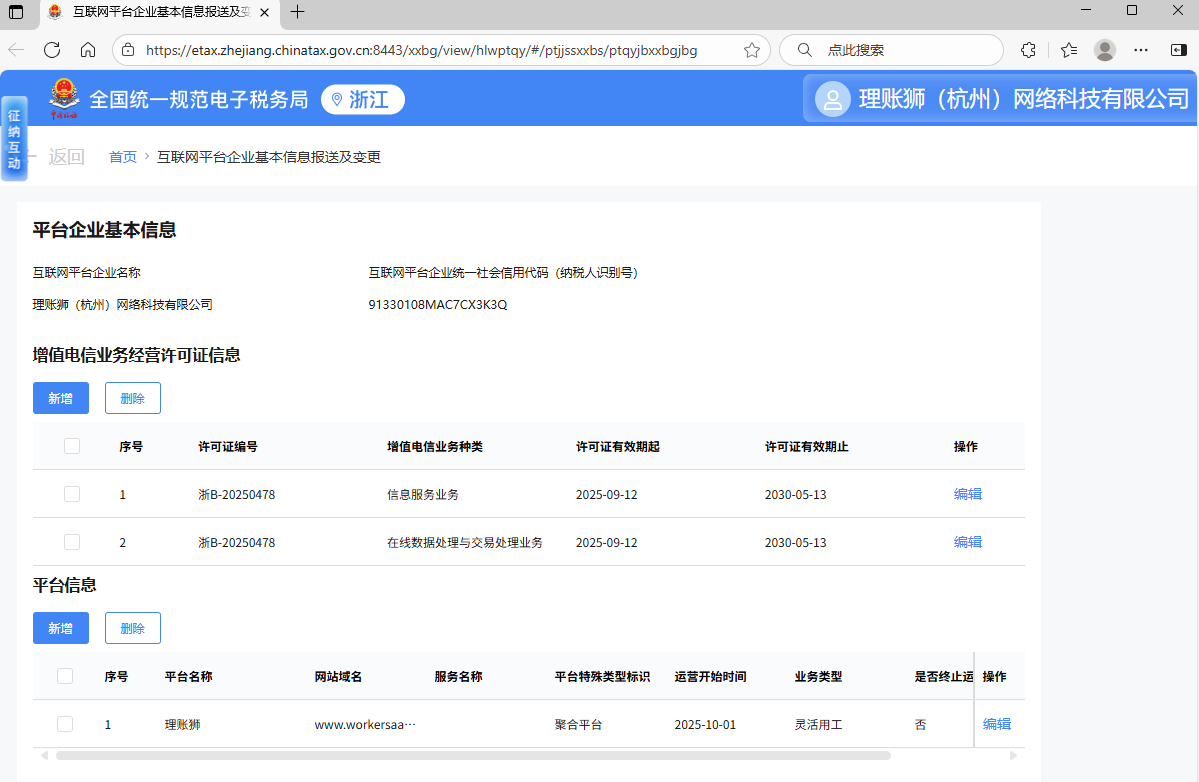 下列为理账狮灵活用工平台备案、缴税、申报凭证。